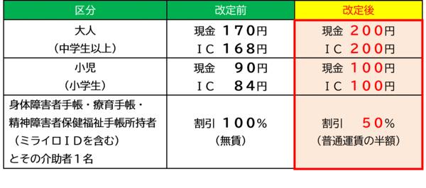 そこで、市内循環バス「ヨッピィ」の収支改善を図るとともに、運賃水準の見直しにより市内公共交通を持続可能なものとするため、市内循環バス「ヨッピィ」の運賃を改定するものです。割引の取扱に関して、これまで無賃でご利用いただいていた方々にも、他の民間路線バスと同様にご負担をいただく形となりますが、今後も引き続き市内循環バス「ヨッピィ」を維持していくために、ご理解とご協力をお願いいたします。
