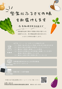 市出身で県外に居住している学生の皆さんを応援するため、市の特産品等を詰め合わせたふるさとの味をお届けします。(受付を終了しました)